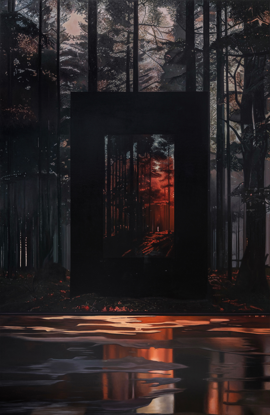 除了洞穴,“潭水”是展览的另一核心意象。在下沉的步道中,艺术家塑造了一个由潭水、建筑般的岛屿及四周数十件相似画作组成的幽深世界。观众“移步换形”间,现实与记忆更替,画面与倒影交织。