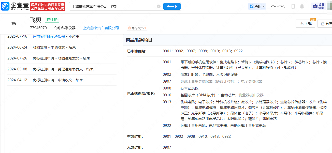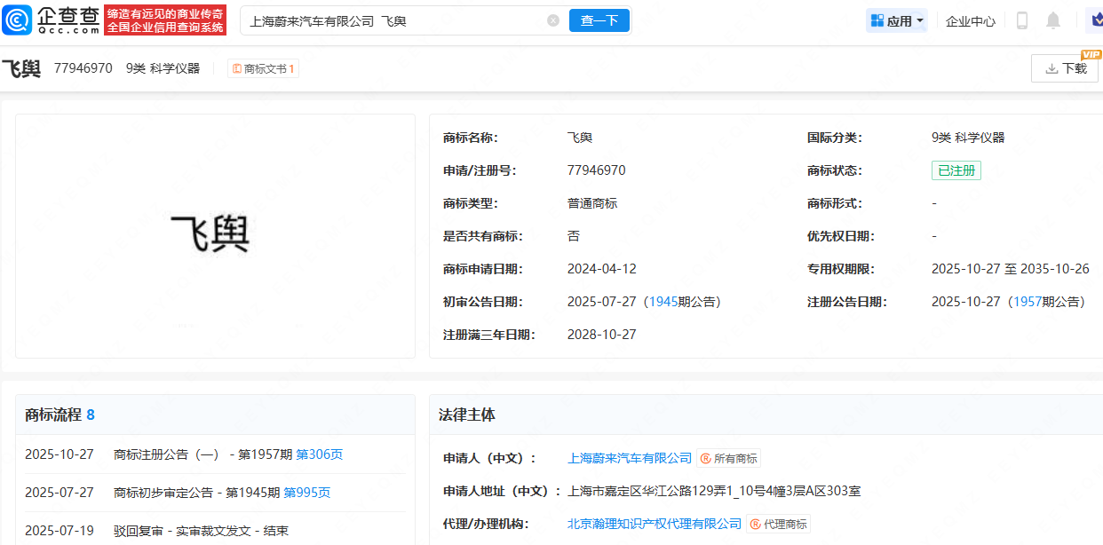 近日证券配资门户网,上海蔚来汽车有限公司申请的“飞舆”商标注册成功,国际分类为9类科学仪器,已申请商品/服务包括:集成电路卡;智能卡(集成电路卡);芯片卡;微芯片卡;集成电路;电子芯片等。