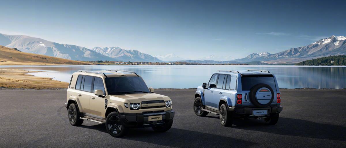 较长的车头设计与规整的车身比例,既保证了硬派气场,又为车内空间提供了充足保障。车身侧面的黑色五辐轮辋、疑似电动侧踏板和 D 柱黑色装饰条,在细节处兼顾了实用性与设计感,而车尾的外置储物箱则进一步凸显了其户外出行的产品定位。